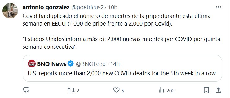 Y LAS DE GRIPE POR POSIBLE DAÑO INMUNOLÓGICO DE COVID PREVIO Covid ha duplicado el número de muertes de la gripe durante esta última semana en EEUU (1.000 de gripe frente a 2.000 por Covid). «Estados Unidos informa más de 2.000 nuevas muertes por COVID por quinta semana consecutiva’