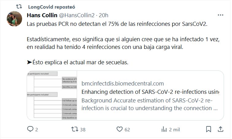 Las pruebas PCR no detectan el 75% de las reinfecciones por SarsCoV2. Estadísticamente, eso significa que si alguien cree que se ha infectado 1 vez, en realidad ha tenido 4 reinfecciones con una baja carga viral. ➤Ésto explica el actual mar de secuelas