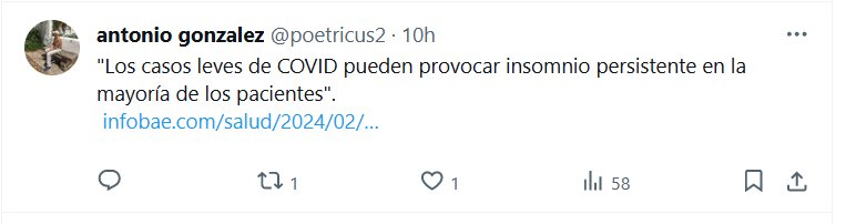 «Los casos leves de COVID pueden provocar insomnio persistente en la mayoría de los pacientes» Posted on febrero 6, 2024 por coronado https://www.infobae.com/salud/2024/02/05/incluso-casos-leves-de-covid-pueden-provocar-insomnio-persistente/