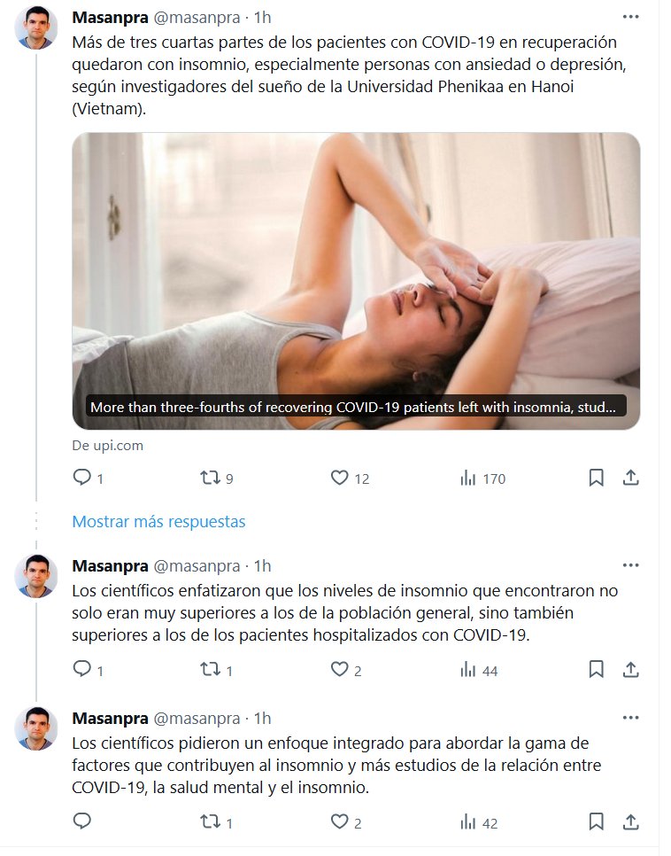 Más de tres cuartas partes de los pacientes con COVID-19 en recuperación quedaron con insomnio, especialmente personas con ansiedad o depresión, según investigadores del sueño de la Universidad Phenikaa en Hanoi (Vietnam)