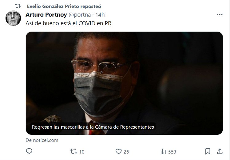 PUERTO RICO Así de bueno está el COVID en PR Regresan las mascarillas a la Cámara de Representantes Posted on febrero 6, 2024 por coronado https://www.noticel.com/legislatura/ahora/top-stories/20240205/regresan-las-mascarillas-a-la-camara-de-representantes/