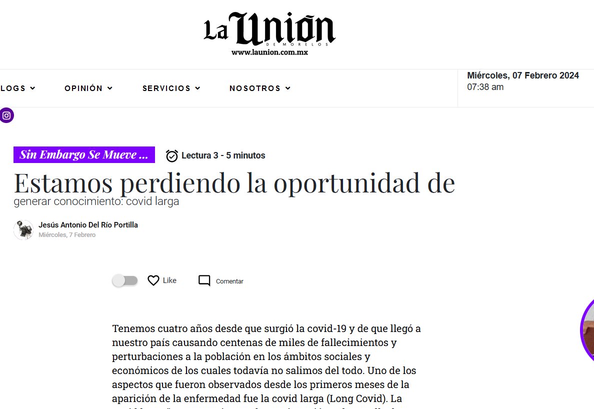 La covid larga “se caracteriza por la continuación o desarrollo de nuevos síntomas tres meses después de que inició la infección causada por el virus del SARS-CoV-2 en los pacientes” Posted on febrero 7, 2024 por coronado https://www.launion.com.mx/opinion/sin-embargo-se-mueve/noticias/243920-estamos-perdiendo-la-oportunidad-de-generar-conocimiento-covid-larga.html
