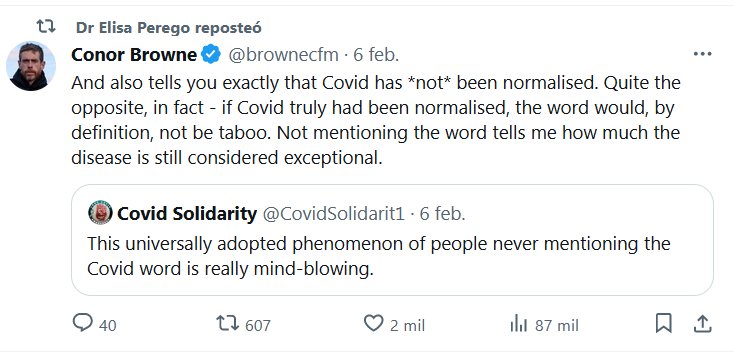 EN INGLÉS Y también te dice exactamente que Covid *no* se ha normalizado. De hecho, todo lo contrario: si Covid realmente se hubiera normalizado, la palabra, por definición, no sería tabú. No mencionar la palabra me dice hasta qué punto la enfermedad todavía se considera excepcional
