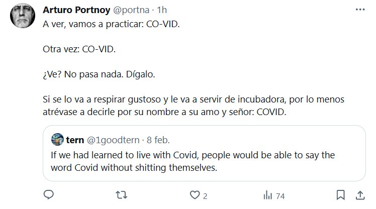 A ver, vamos a practicar: CO-VID. Otra vez: CO-VID. ¿Ve? No pasa nada. Dígalo. Si se lo va a respirar gustoso y le va a servir de incubadora, por lo menos atrévase a decirle por su nombre a su amo y señor: COVID