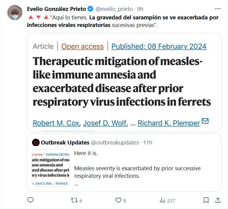 LÉASE COVID 🔺🔻🔺»Aquí lo tienes. La gravedad del sarampión se ve exacerbada por infecciones virales respiratorias sucesivas previas» Posted on febrero 9, 2024 por coronado https://twitter.com/outbreakupdates/status/1755757887115198684
