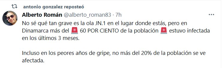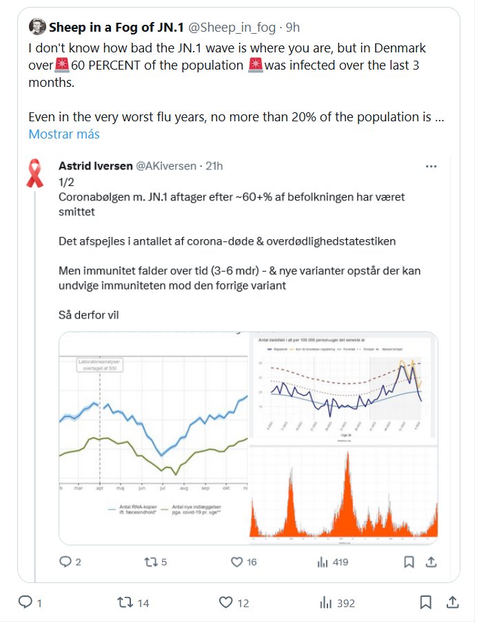 No sé qué tan grave es la ola JN.1 en el lugar donde estás, pero en Dinamarca más del 🚨 60 POR CIENTO de la población 🚨 estuvo infectada en los últimos 3 meses. Incluso en los peores años de gripe, no más del 20% de la población se ve afectada