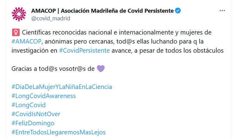 ♀️ Científicas reconocidas nacional e internacionalmente y mujeres de #AMACOP, anónimas pero cercanas, tod@s ellas luchando para q la investigación en #CovidPersistente avance, a pesar de todos los obstáculos Gracias a tod@s vosotr@s de 💜 #DiaDeLaMujerYLaNiñaEnLaCiencia