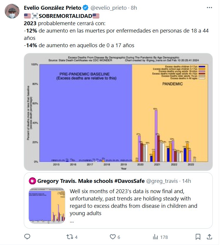 🇺🇸☠️SOBREMORTALIDAD🇺🇸 2023 probablemente cerrará con: -12% de aumento en las muertes por enfermedades en personas de 18 a 44 años -14% de aumento en aquellos de 0 a 17 años Posted on febrero 11, 2024 por coronado