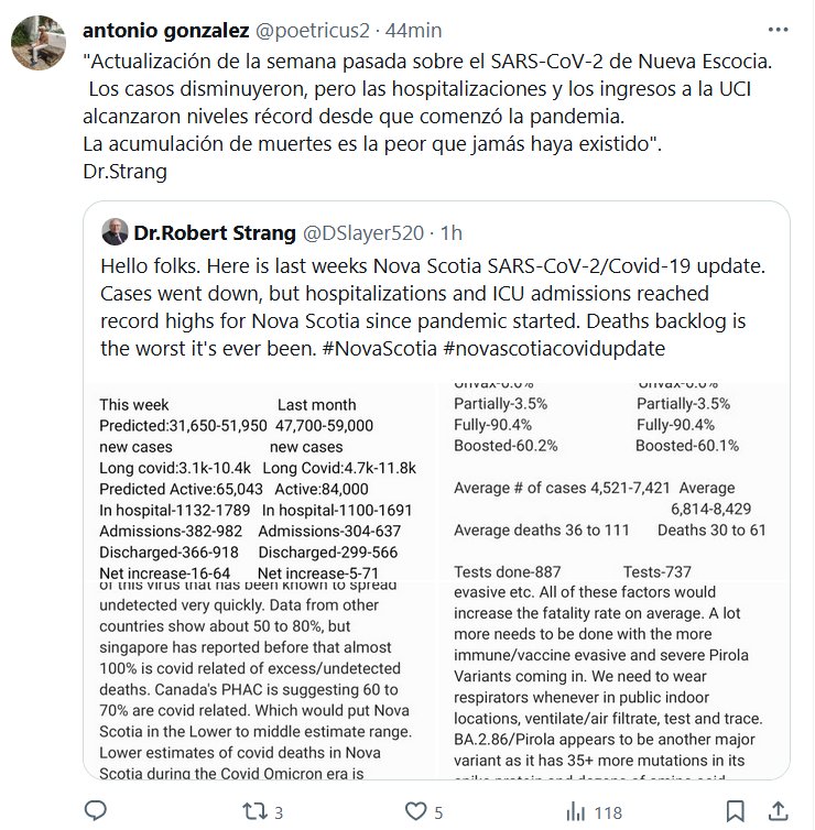 «Actualización de la semana pasada sobre el SARS-CoV-2 de Nueva Escocia. Los casos disminuyeron, pero las hospitalizaciones y los ingresos a la UCI alcanzaron niveles récord desde que comenzó la pandemia. La acumulación de muertes es la peor que jamás haya existido». Dr.Strang
