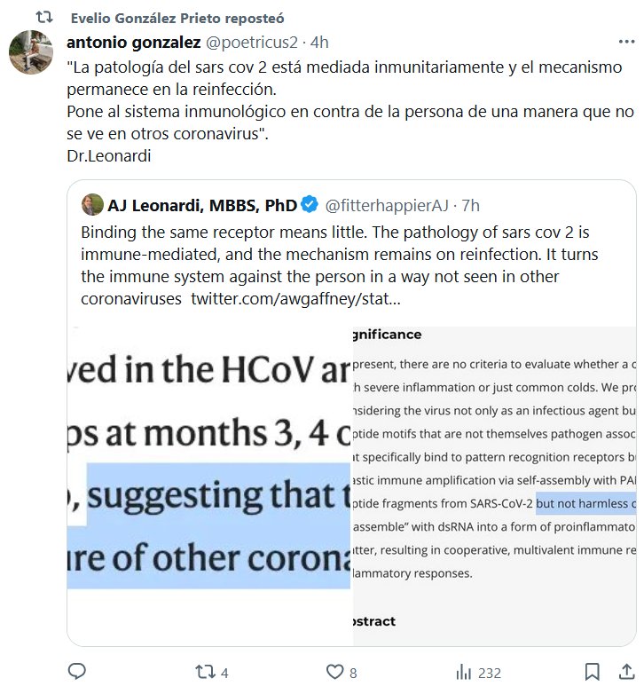 «La patología del sars cov 2 está mediada inmunitariamente y el mecanismo permanece en la reinfección. Pone al sistema inmunológico en contra de la persona de una manera que no se ve en otros coronavirus». Dr.Leonardi