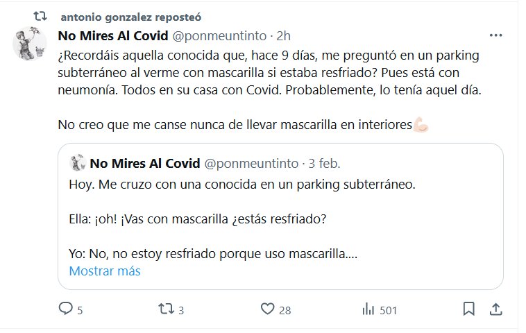 TESTIMONIOS ¿Recordáis aquella conocida que, hace 9 días, me preguntó en un parking subterráneo al verme con mascarilla si estaba resfriado? Pues está con neumonía. Todos en su casa con Covid. Probablemente, lo tenía aquel día. No creo que me canse nunca de llevar mascarilla en interiores💪🏻