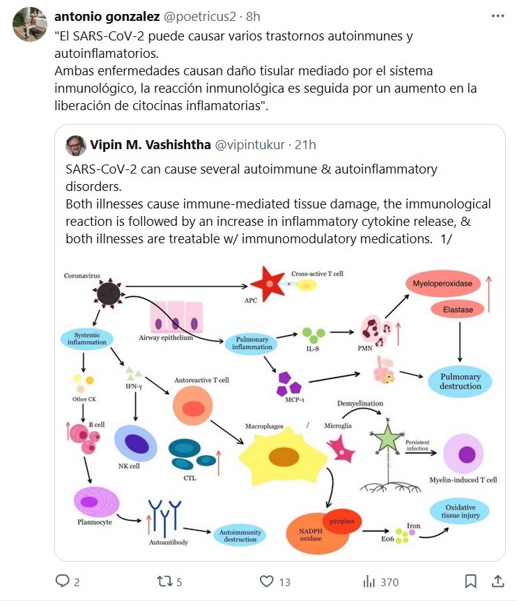 «El SARS-CoV-2 puede causar varios trastornos autoinmunes y autoinflamatorios. Ambas enfermedades causan daño tisular mediado por el sistema inmunológico, la reacción inmunológica es seguida por un aumento en la liberación de citocinas inflamatorias».