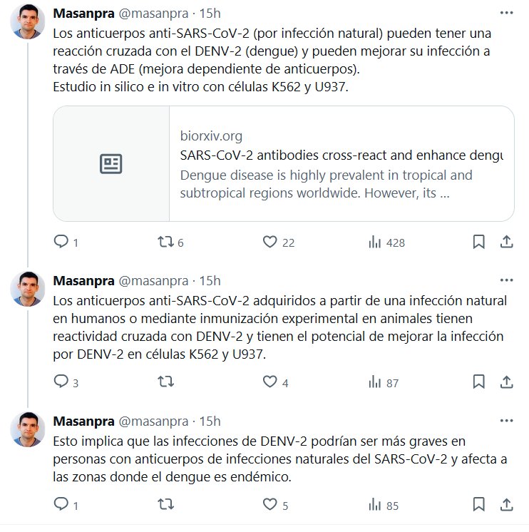 Los anticuerpos anti-SARS-CoV-2 (por infección natural) pueden tener una reacción cruzada con el DENV-2 (dengue) y pueden mejorar su infección a través de ADE (mejora dependiente de anticuerpos).