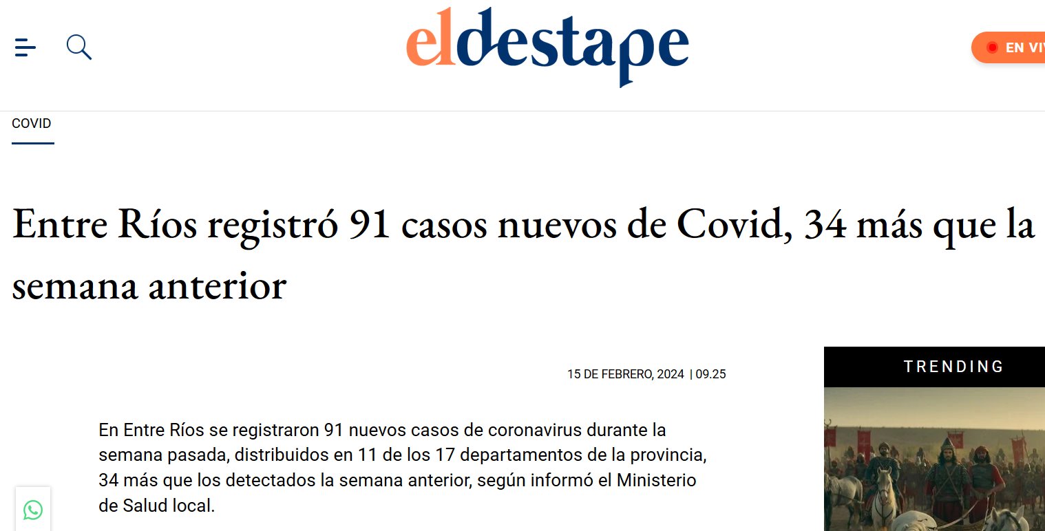 SE ACELERA Entre Ríos registró 91 casos nuevos de Covid, 34 más que la semana anterior Posted on febrero 15, 2024 por coronado https://www.eldestapeweb.com/informacion-general/covid/entre-rios-registro-91-casos-nuevos-de-covid-34-mas-que-la-semana-anterior-20242159250