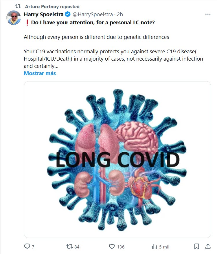 Lamentablemente, muchos todavía mueren a causa del C19, pero la vacunación ya ha salvado millones de vidas y ha ayudado a controlar la carga de esta enfermedad para muchos. Es importante destacar que con la fuerte evolución mutacional inmune evasiva del SarsCoV2, su riesgo de (re) infección aumenta a medida que la inmunidad a través de una infección o vacunación previa retrasará la evolución viral o simplemente disminuirá, dejándolo susceptible a nuevas infecciones, aunque la protección contra la enfermedad grave C-19 parece para durar más. Sin mitigación, sin una política de aire limpio y con una menor aceptación de refuerzos de vacunas, intencionalmente o no, las reinfecciones se convertirán en un problema creciente para muchos. Lamentablemente, cada nueva infección conlleva un riesgo independiente pero creciente de desarrollo de Longcovid. Con mucha ciencia disponible, está claro que la vacunación no es la solución milagrosa contra el LC. Decirte a ti mismo que estoy vacunado o que tuve Ci9, por lo que estoy protegido, tengo inmunidad, NO ES CIERTO, y es una actitud peligrosa para ti y tus seres queridos, incluidos los niños. SarsCoV2 aún es nuevo, las implicaciones a largo plazo posteriores a la (re) infección con o sin Longcovid sintomático siguen siendo un problema de salud muy preocupante, que ya afecta las vidas de muchos millones, al tiempo que es el foco de una intensa investigación en curso en todo el mundo. Una preocupación aún mayor es el creciente número de infecciones bacterianas, fúngicas y virales (co-) nuevas y diferentes a raíz del C19, probablemente como una manifestación de una disfunción inmune posterior al C-19 (= Longcovid “silencioso”) y no... ...esto NO es una deuda de inmunidad, eso ya está científicamente desacreditado. Muchos ya hablan de esto: "una infección tras otra... ¡es extraño, no puedo volver a mejorar!". Todos ya sabemos que la pandemia del C19 todavía está entre nosotros, incluso la OMS lo confirmó recientemente; lamentablemente muchos gobiernos prefieren una política ignorante de avestruz en favor de las economías, un enfoque a muy corto plazo, como ya lo demuestran algunas economías con grandes consecuencias y pérdida de producción, incluso signos de recesión. ¡Esto no es prometedor! Por lo tanto, estás solo y te dejo este consejo personal: