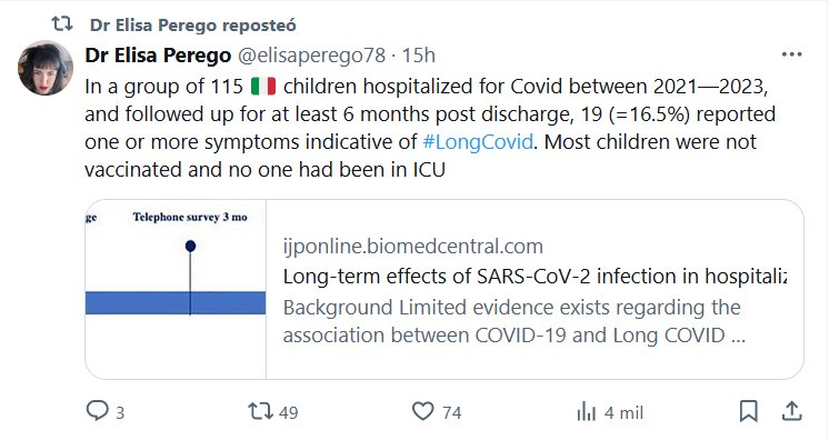 EN INGLÉS Dra. Elisa Perego @elisaperego78 · En un grupo de 115 🇮🇹 niños hospitalizados por Covid entre 2021 y 2023, y seguidos durante al menos 6 meses después del alta, 19 (=16,5%) informaron uno o más síntomas indicativos de #LongCovid. La mayoría de los niños no estaban vacunados y nadie había estado en la UCI