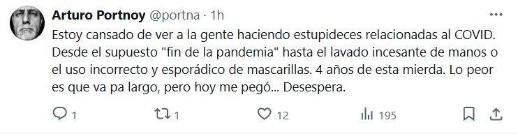 Estoy cansado de ver a la gente haciendo estupideces relacionadas al COVID. Desde el supuesto «fin de la pandemia» hasta el lavado incesante de manos o el uso incorrecto y esporádico de mascarillas. 4 años de esta mierda. Lo peor es que va pa largo, pero hoy me pegó… Desespera.