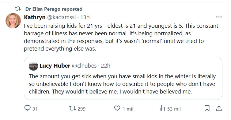 He estado criando niños durante 21 años: el mayor tiene 21 y el menor 5. Este aluvión constante de enfermedades nunca ha sido normal. Se está normalizando, como se demuestra en las respuestas, pero no era "normal" hasta que intentamos fingir que todo lo demás lo era.