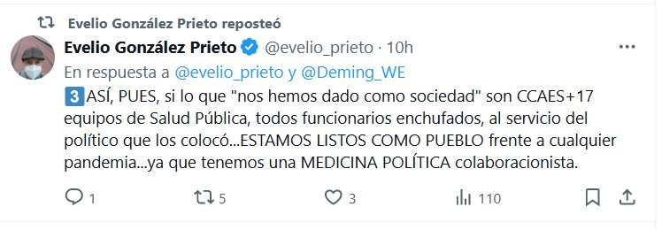 VOCES: ASÍ, PUES, si lo que «nos hemos dado como sociedad» son CCAES+17 equipos de Salud Pública, todos funcionarios enchufados, al servicio del político que los colocó…ESTAMOS LISTOS COMO PUEBLO frente a cualquier pandemia…ya que tenemos una MEDICINA POLÍTICA colaboracionista.