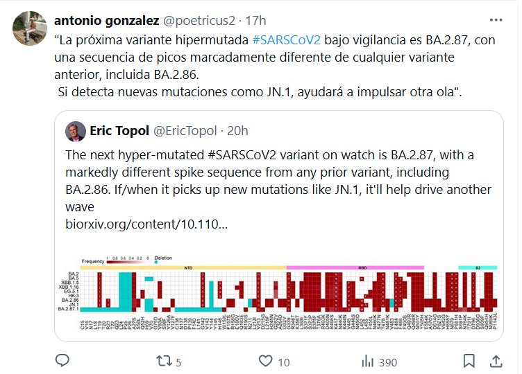 «La próxima variante hipermutada #SARSCoV2 bajo vigilancia es BA.2.87, con una secuencia de picos marcadamente diferente de cualquier variante anterior, incluida BA.2.86. Si detecta nuevas mutaciones como JN.1, ayudará a impulsar otra ola»