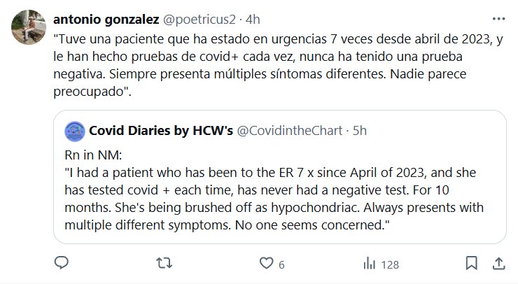 PARA EL PRÍNCIPE DE ESTE MUNDO ERES DESCARTABLE «Tuve una paciente que ha estado en urgencias 7 veces desde abril de 2023, y le han hecho pruebas de covid+ cada vez, nunca ha tenido una prueba negativa. Siempre presenta múltiples síntomas diferentes. Nadie parece preocupado»