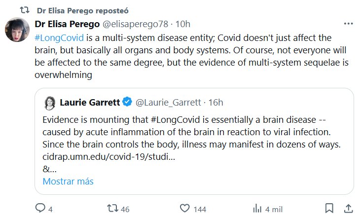 EN INGLÉS Dra. Elisa Perego @elisaperego78 · #LongCovid es una entidad patológica multisistémica; El Covid no sólo afecta al cerebro, sino básicamente a todos los órganos y sistemas del cuerpo. Por supuesto, no todos se verán afectados en el mismo grado, pero la evidencia de secuelas multisistémicas es abrumadora.