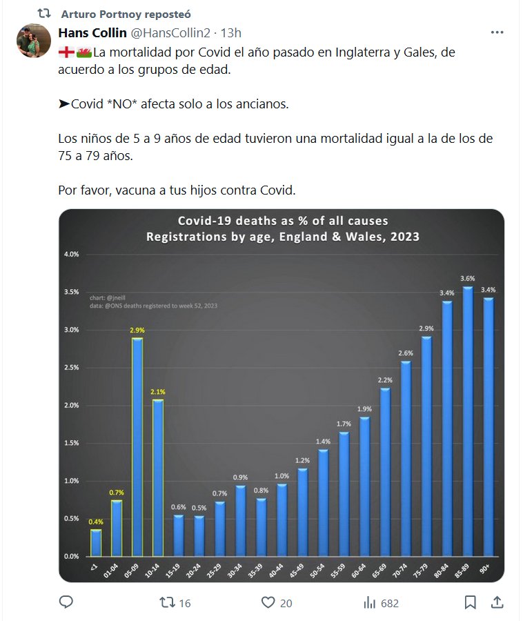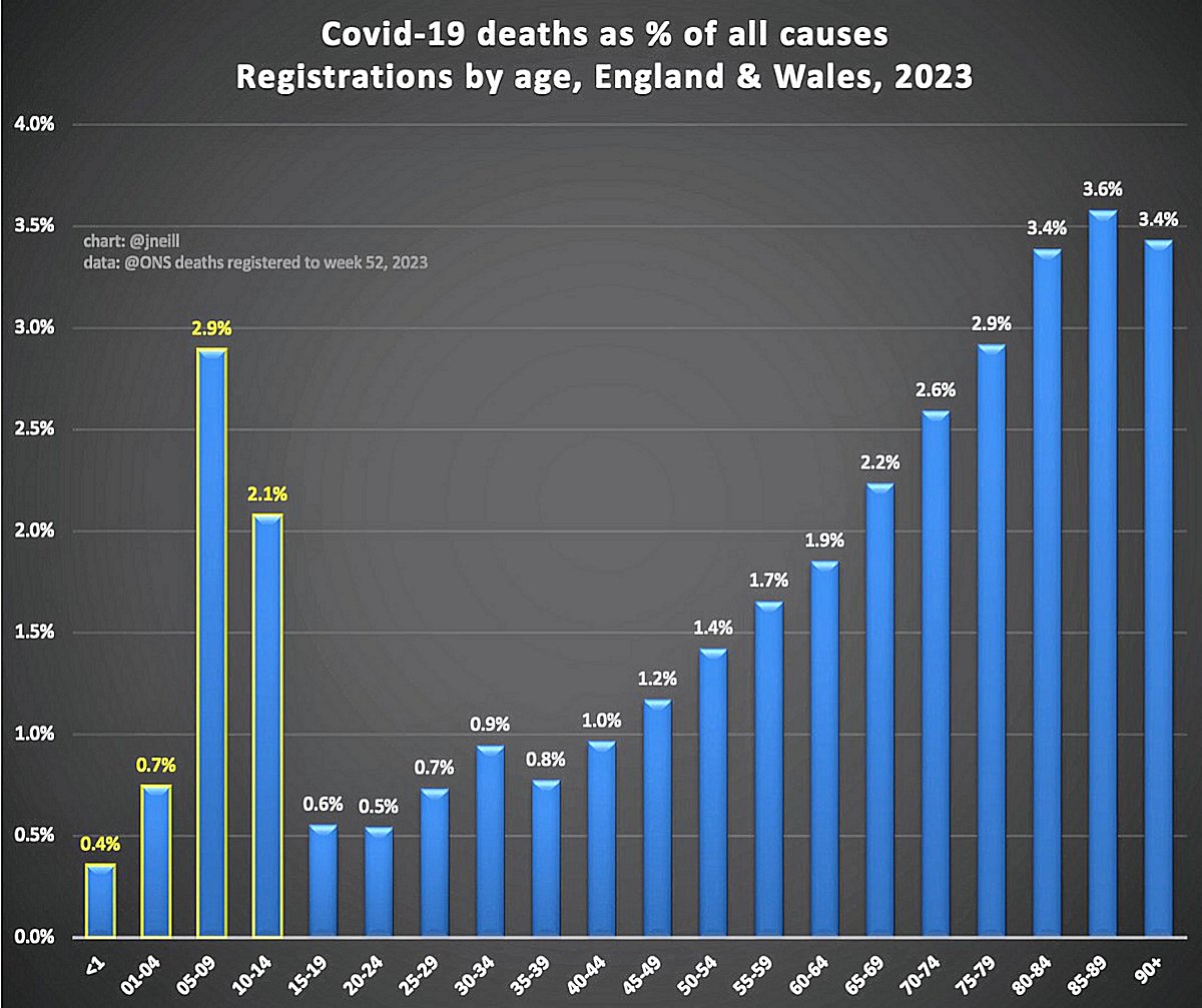 🏴🏴La mortalidad por Covid el año pasado en Inglaterra y Gales, de acuerdo a los grupos de edad. ➤Covid *NO* afecta solo a los ancianos. Los niños de 5 a 9 años de edad tuvieron una mortalidad igual a la de los de 75 a 79 años. Por favor, vacuna a tus hijos contra Covid.