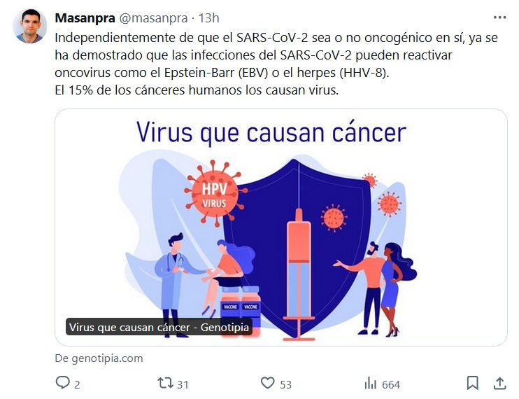 LA CAJA PANDORA COVID ESTÁ ABIERTA Independientemente de que el SARS-CoV-2 sea o no oncogénico en sí, ya se ha demostrado que las infecciones del SARS-CoV-2 pueden reactivar oncovirus como el Epstein-Barr (EBV) o el herpes (HHV-8). El 15% de los cánceres humanos los causan virus