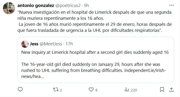 ÉPOCAS DE COVID MORTAL «Nueva investigación en el hospital de Limerick después de que una segunda niña muriera repentinamente a los 16 años. La joven de 16 años murió repentinamente el 29 de enero, horas después de que fuera trasladada de urgencia a la UHL por dificultades respiratorias»