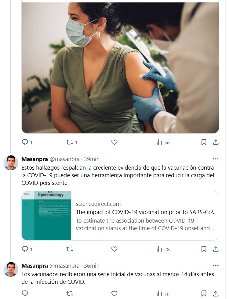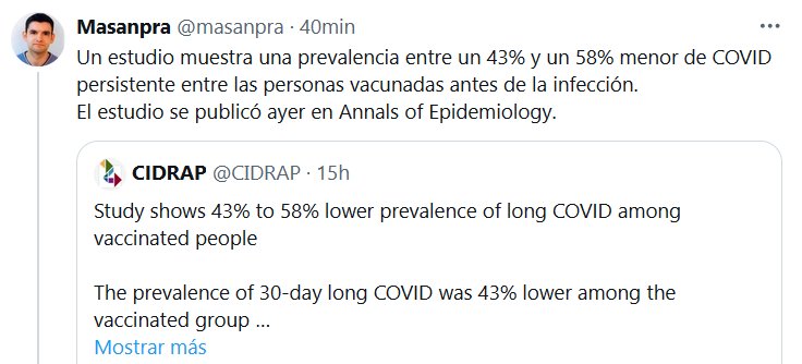 Un estudio muestra una prevalencia entre un 43% y un 58% menor de COVID persistente entre las personas vacunadas antes de la infección. El estudio se publicó ayer en Annals of Epidemiology Posted on febrero 21, 2024 por coronado https://www.sciencedirect.com/science/article/abs/pii/S1047279724000310