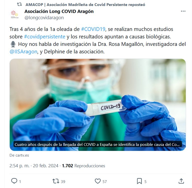 AMACOP | Asociación Madrileña de Covid Persistente reposteó Asociación Long COVID Aragón @longcovidaragon Tras 4 años de la 1a oleada de #COVID19, se realizan muchos estudios sobre #covidpersistente y los resultados apuntan a causas biológicas. 🎙 Hoy nos habla de investigación la Dra. Rosa Magallón, investigadora del @IISAragon , y Delphine de la asociación.