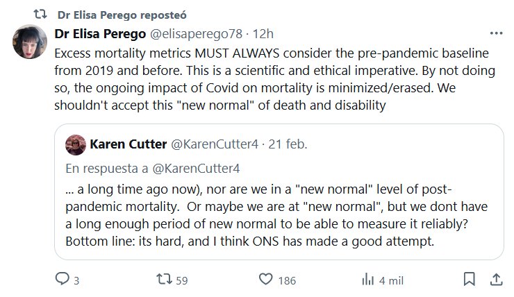 EN INGLÉS Dra. Elisa Perego @elisaperego78 · Las métricas de exceso de mortalidad SIEMPRE DEBEN considerar la línea de base prepandémica de 2019 y antes. Este es un imperativo científico y ético. Al no hacerlo, se minimiza/borra el impacto actual de Covid en la mortalidad. No deberíamos aceptar esta «nueva normalidad» de muerte y discapacidad