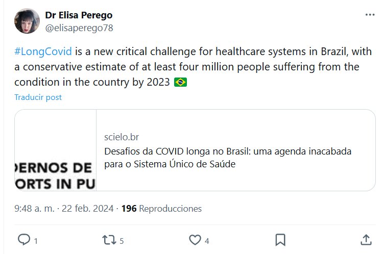 EN INGLÉS / PORTUGUÉS Dra. Elisa Perego @elisaperego78 #LongCovid es un nuevo desafío crítico para los sistemas de salud en Brasil, con una estimación conservadora de que al menos cuatro millones de personas padecerán esta afección en el país para 2023 🇧🇷