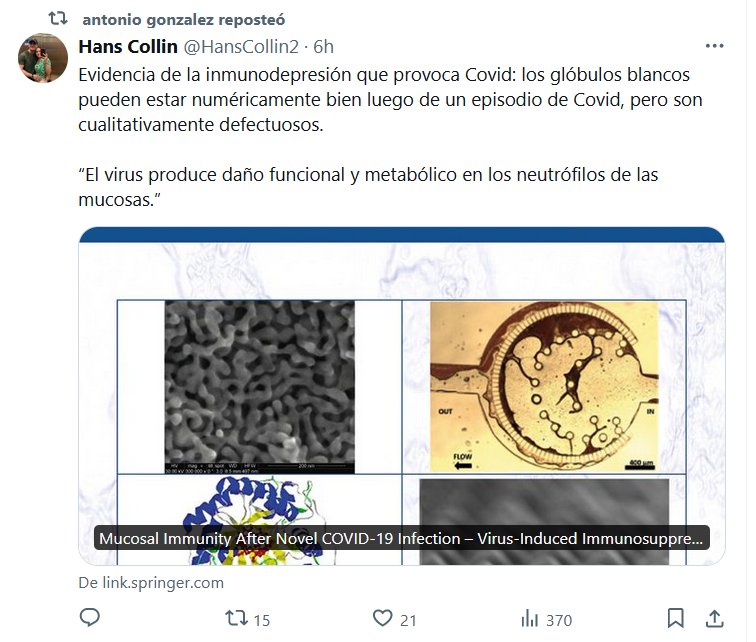 Evidencia de la inmunodepresión que provoca Covid: los glóbulos blancos pueden estar numéricamente bien luego de un episodio de Covid, pero son cualitativamente defectuosos. “El virus produce daño funcional y metabólico en los neutrófilos de las mucosas.”