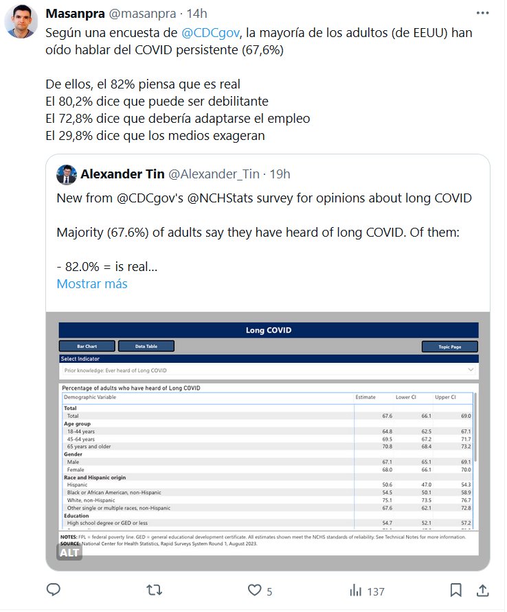 Y EL OTRO 32% VIVE EN LA LUNA? Según una encuesta de @CDCgov , la mayoría de los adultos (de EEUU) han oído hablar del COVID persistente (67,6%) Posted on febrero 22, 2024 por coronado
