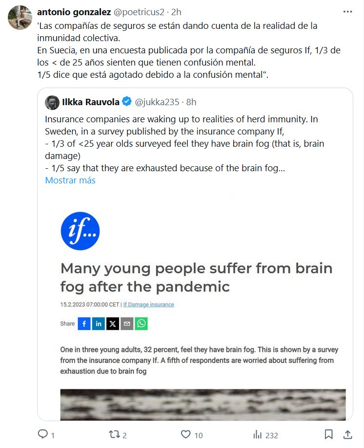 LA GENERACIÓN DE LOS COVIDIOTAS ‘Las compañías de seguros se están dando cuenta de la realidad de la inmunidad colectiva. En Suecia, en una encuesta publicada por la compañía de seguros If, 1/3 de los < de 25 años sienten que tienen confusión mental. 1/5 dice que está agotado debido a la confusión mental"