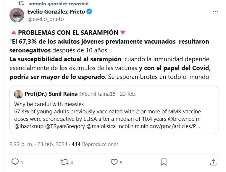 LA CAJA PANDORA POSTCOVID ESTÁ ABIERTA 🔺PROBLEMAS CON EL SARAMPIÓN🔻 «El 67,3% de los adultos jóvenes previamente vacunados resultaron seronegativos después de 10 años. La susceptibilidad actual al sarampión, cuando la inmunidad depende esencialmente de los estímulos de las vacunas y con el papel del Covid, podría ser mayor de lo esperado. Se esperan brotes en todo el mundo»