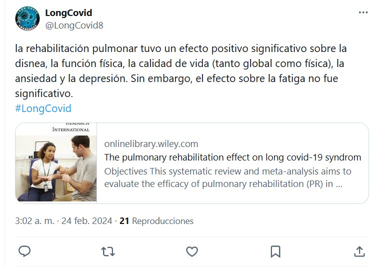 LongCovid @LongCovid8 la rehabilitación pulmonar tuvo un efecto positivo significativo sobre la disnea, la función física, la calidad de vida (tanto global como física), la ansiedad y la depresión. Sin embargo, el efecto sobre la fatiga no fue significativo. #LongCovid