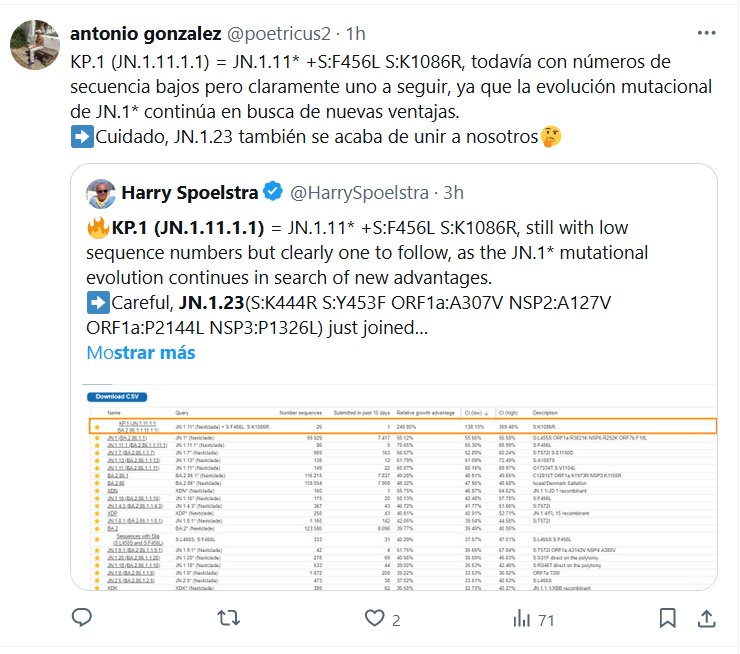 PANDEMIA LIBERADA=PANDEMIA ETERNA! KP.1 (JN.1.11.1.1) = JN.1.11* +S:F456L S:K1086R, todavía con números de secuencia bajos pero claramente uno a seguir, ya que la evolución mutacional de JN.1* continúa en busca de nuevas ventajas. ➡️Cuidado, JN.1.23 también se acaba de unir a nosotros🤔