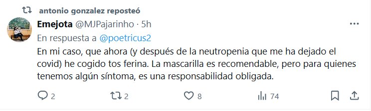 PATOLOGÍAS POSTCOVID «En mi caso, que ahora (y después de la neutropenia que me ha dejado el covid) he cogido tos ferina. La mascarilla es recomendable, pero para quienes tenemos algún síntoma, es una responsabilidad obligada»