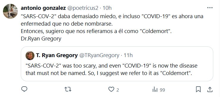 SORNA, IRONÍA, SOCARRONERÍA, SARCASMO: LA GRIPE DE LA MUERTE «SARS-COV-2» daba demasiado miedo, e incluso «COVID-19» es ahora una enfermedad que no debe nombrarse. Entonces, sugiero que nos refieramos a él como «Coldemort». Dr.Ryan Gregory