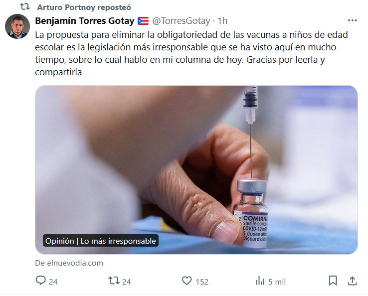 Benjamín Torres Gotay 🇵🇷 @TorresGotay · La propuesta para eliminar la obligatoriedad de las vacunas a niños de edad escolar es la legislación más irresponsable que se ha visto aquí en mucho tiempo, sobre lo cual hablo en mi columna de hoy. Gracias por leerla y compartirla
