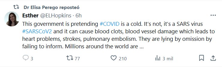 EN INGLÉS «Este gobierno finge que el #COVID es un resfriado. No lo es, es un virus del SARS, #SARSCoV2, y puede causar coágulos sanguíneos, daños en los vasos sanguíneos que provocan problemas cardíacos, accidentes cerebrovasculares y embolia pulmonar. Mienten por omisión al no informar»