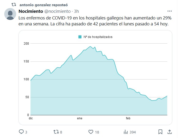 Los enfermos de COVID-19 en los hospitales gallegos han aumentado un 29% en una semana. La cifra ha pasado de 42 pacientes el lunes pasado a 54 hoy Posted on febrero 26, 2024 por coronado