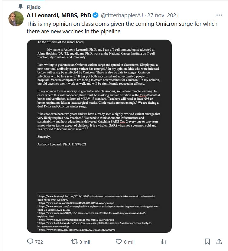 TAN VIGENTE AYER COMO SIEMPRE (EN INGLÉS) AJ Leonardi, MBBS, doctorado @fitterhappierAJ · 27 de noviembre. 2021 Esta es mi opinión sobre las aulas dado el próximo aumento de Omicron para el que hay nuevas vacunas en proceso