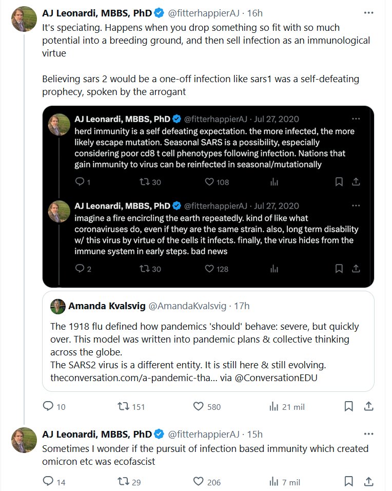 AJ Leonardi, MBBS, doctorado @fitterhappierAJ (EN INGLÉS) Creer que sars 2 sería una infección única como sars1 era una profecía contraproducente, pronunciada por los arrogantes. Posted on febrero 28, 2024 por coronado