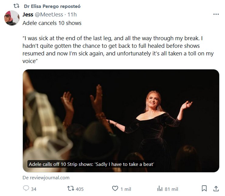 COVID MATÓ A LA REINA ¡NO HACE EXCEPCIONES! Adele cancela 10 shows “Estuve enfermA al final del último tramo y durante todo el descanso. No había tenido la oportunidad de recuperarme por completo antes de que se reanudaran los espectáculos y ahora estoy enfermA de nuevo y, lamentablemente, todo ha pasado factura a mi voz”
