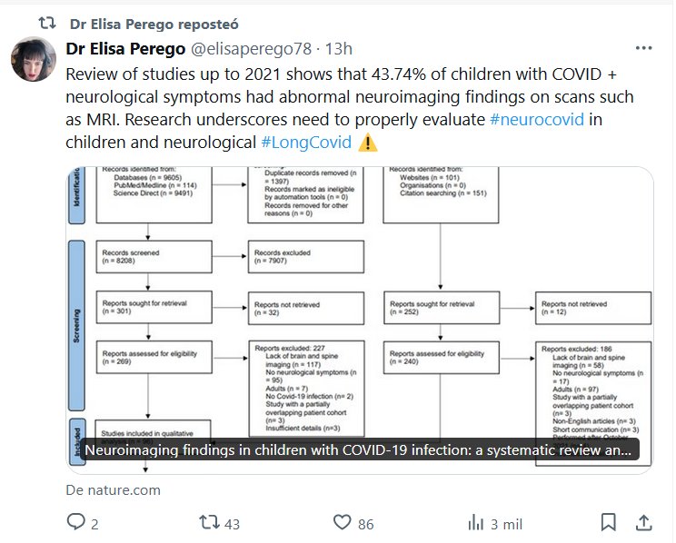 EN INGLÉS La revisión de estudios hasta 2021 muestra que el 43,74% de los niños con síntomas neurológicos de COVID + tuvieron hallazgos anormales en neuroimagen en exploraciones como la resonancia magnética. La investigación subraya la necesidad de evaluar adecuadamente el #neurocovid en niños y el #LongCovid neurológico ⚠️