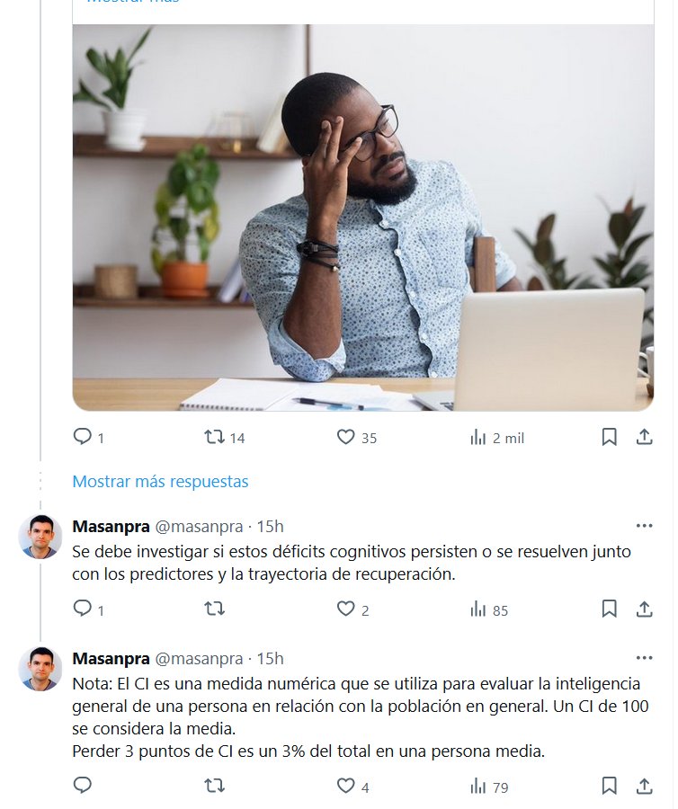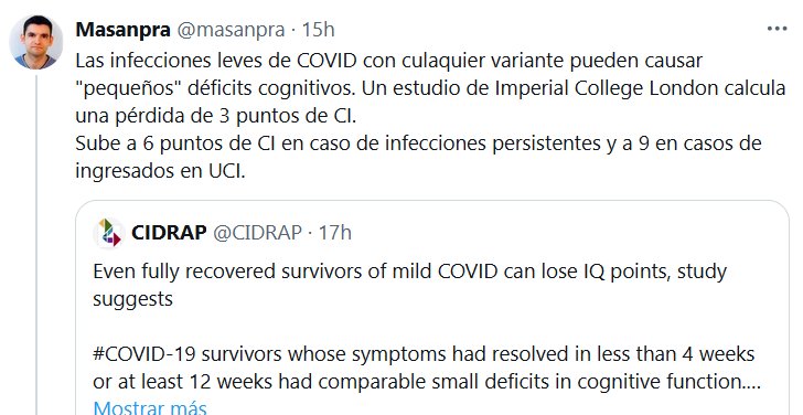 Las infecciones leves de COVID con culaquier variante pueden causar «pequeños» déficits cognitivos. Un estudio de Imperial College London calcula una pérdida de 3 puntos de CI. Sube a 6 puntos de CI en caso de infecciones persistentes y a 9 en casos de ingresados en UCI
