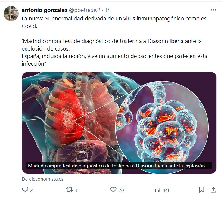 La nueva Subnormalidad derivada de un virus inmunopatogénico como es Covid. ‘Madrid compra test de diagnóstico de tosferina a Diasorin Iberia ante la explosión de casos. España, incluida la región, vive un aumento de pacientes que padecen esta infección»